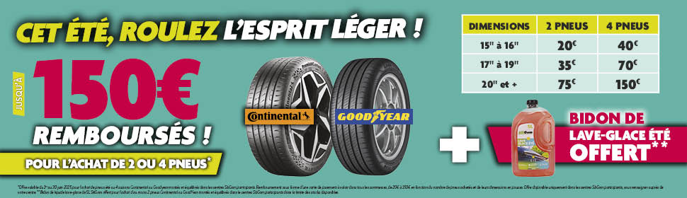 Changez vos pneus avant votre départ en vacances et profitez de notre offre pour rouler l’esprit léger cet été : Jusqu’à 150€ remboursés pour l’achat de pneus été ou 4 saisons des marques Continental et GoodYear & repartez avec un bidon de lave-glace SiliGom offert.